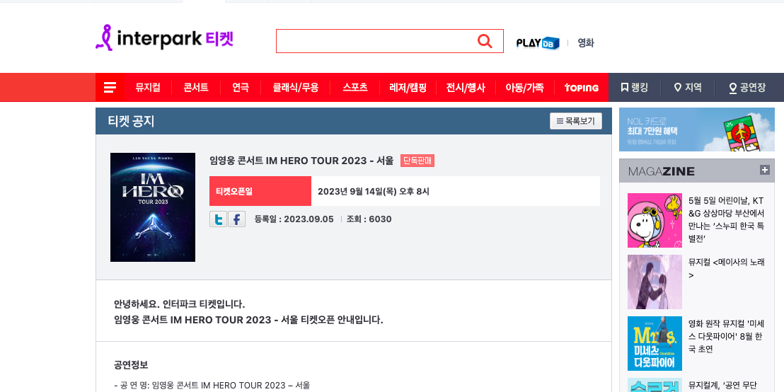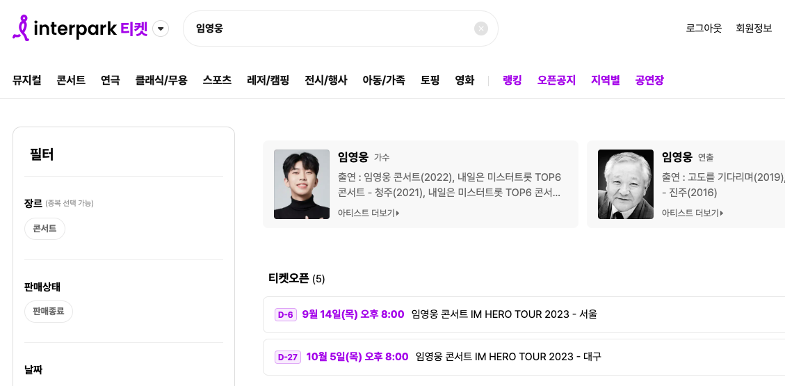 2) 인터파크 티켓 홈페이지에서 '임영웅'을 검색하기