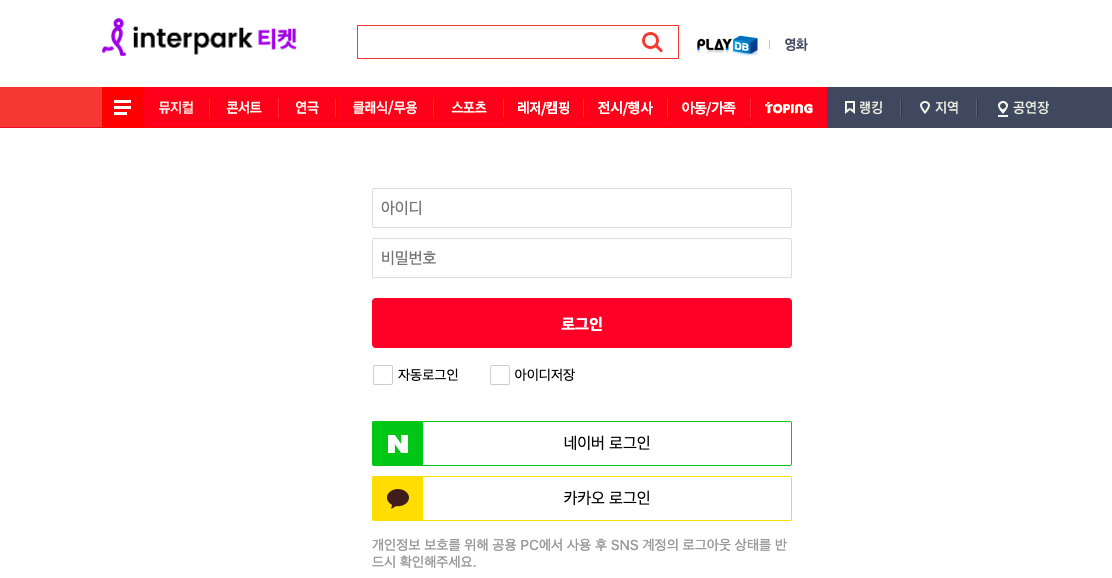인터파크는 미리 회원가입을 해 두시면 훨씬 빠르게 예매를 진행하실 수 있습니다.