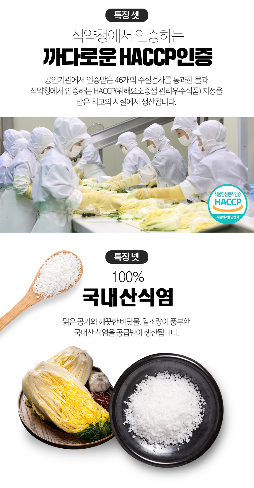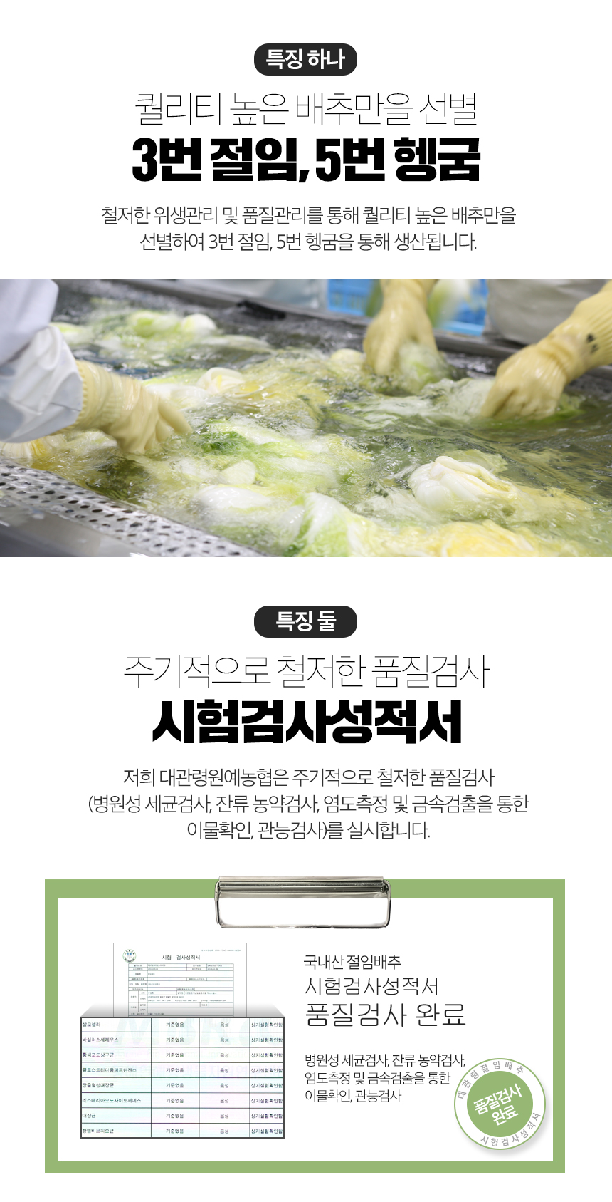 괴산 고랭지 배추는 일교차가 큰 지역적 특성으로 배추 자체의 맛과 품질이 뛰어납니다. 합성 비료는 사용하지 않고 농약을 최소화하여 오로지 자연의 힘으로 90일간 길러내어 노랗고 맛있는 배추로 길러냅니다. 전국에서 물 좋기로 유명한 충북 괴산의 지하 150m 암반수로 기르고 절여 깨끗합니다. 신안 도초농협 천일염으로 절이고 괴산청정암반수로 3번 씻고, 괴산 농업기술센터에서 직접 관리하기 때문에 더욱 믿을 수 있습니다.